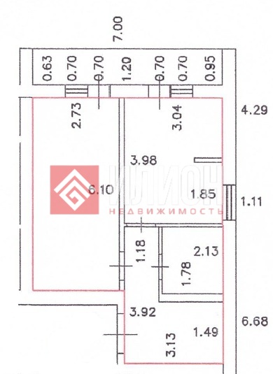- Общая площадь: 40 м² (кухня 12,1 м², комната 16,7 м²);
