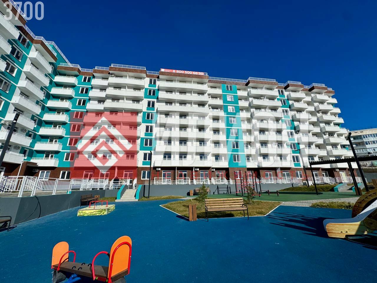 • Территория благоустроена, есть зелёные зоны, бассейн и места для отдыха, детская и спортивная площадки.